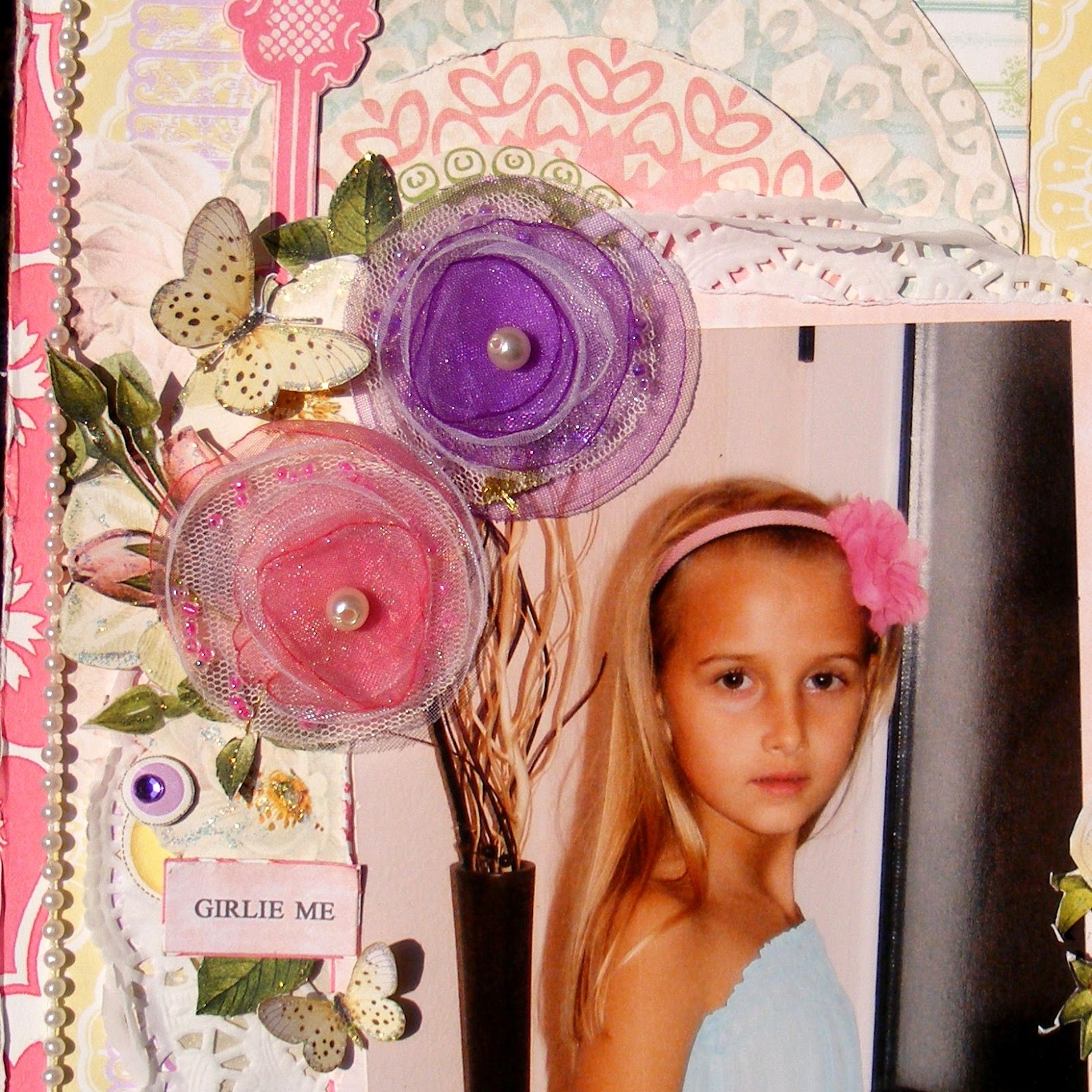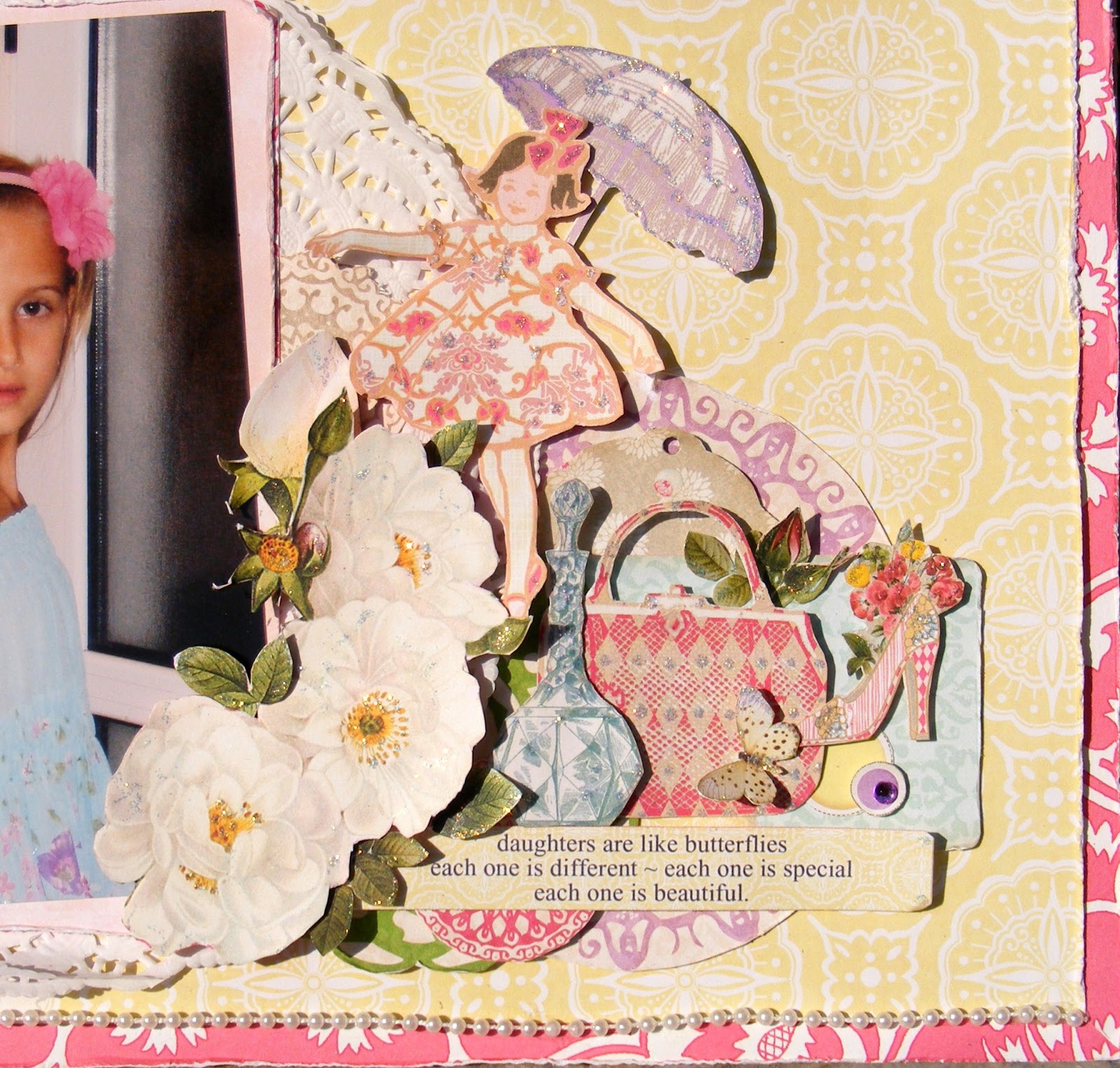I did a lot of fussy cutting and layering. I also used the mini messages stickers from the Girl Land collection. The pink and the purple flower are the Princess Petals from the same collection.