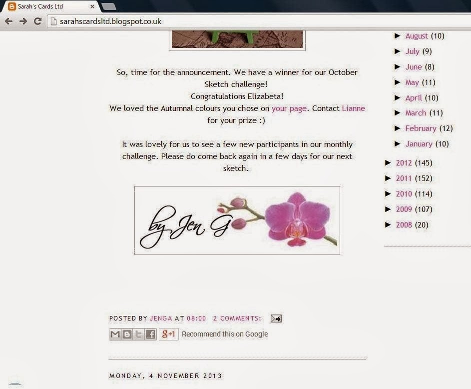 I won the first prize at Sarah's Cards Ltd for their October Sketch Challenge. Thank you ladies for choosing me as the winner. Your sketches are always a pleasure to work with.