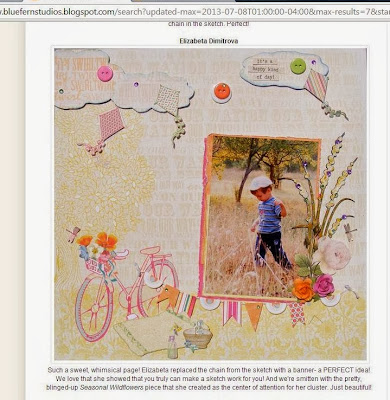 I have two of my layouts featured on the Blue Fern Studios Blog. The first one was made for the June Sketch Challenge and the second for the July Sketch Challenge; I love the sketches at BFS and their chipboard products are amazing.